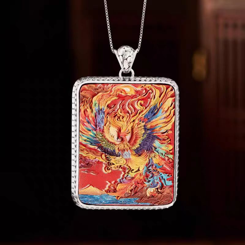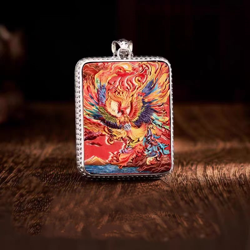 Painted cinnabar phoenix silver thangka pendant